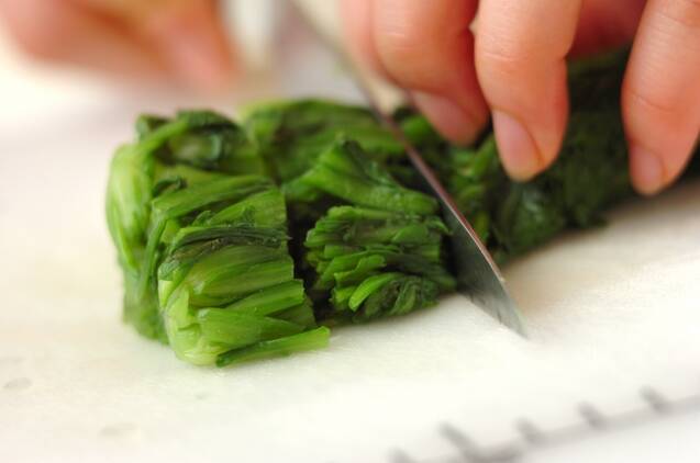 春菊はきれいに水洗いし、熱湯でサッとゆでる。冷水に取って水気を絞り、長さ2cmに切る。