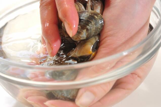 お米は水洗いし、たっぷりの水に30分位浸水させる。アサリは分量外の塩水でこすり洗いし、水気をきる。エビは背ワタを取る。