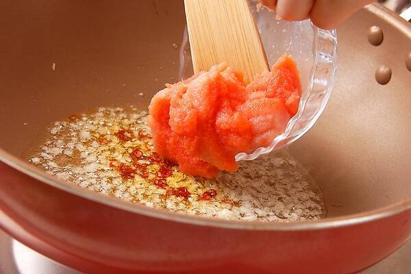 スパゲティをゆでている間に、フライパンにオリーブ油、ニンニクを入れて弱火にかけ、香りが立ってくれば、刻み赤唐辛子とタラコを加え、木ベラで混ぜながら炒める。