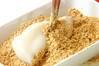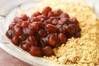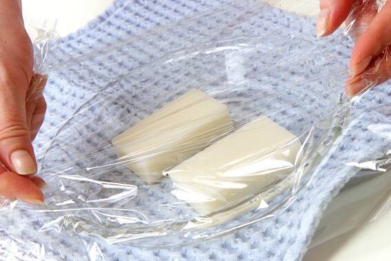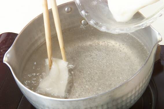 1個を半分に切り水でぬらしたお餅を、耐熱皿に重ならないように並べ、ラップをかけて電子レンジで45~60秒位加熱する。柔らかくなれば、お湯につけておく。