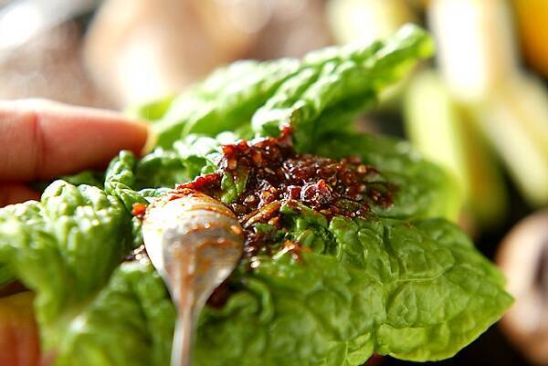 チマサンチュに<合わせみそ>を薄く塗り、焼けた物に<つけダレ>をつけ、巻いていただく。もちろん、焼けた物を<つけダレ>につけるだけでも美味しいですよ!チマサンチュに<合わせみそ>を薄く塗り、ご飯を巻いていただくのも美味しいです。
