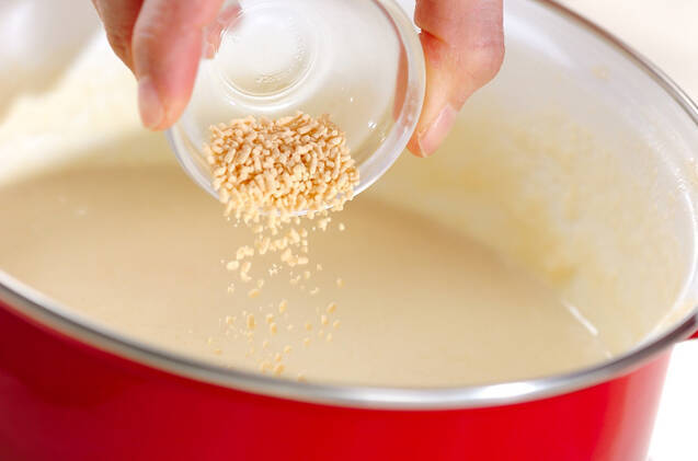 時々混ぜながら再びフツフツしてきたら、顆粒スープの素、塩コショウで味を調え、トロミがつくまで混ぜながら加熱する。