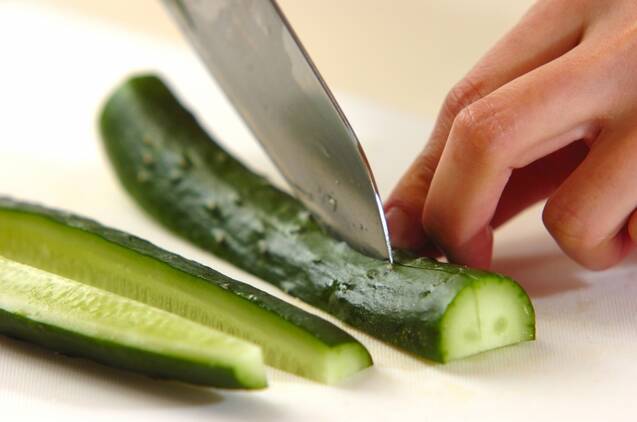 キュウリは縦4等分に切る。セロリはキュウリの長さに合わせて4等分に切り、冷水に放つ。ニンジンは皮を剥き、キュウリの長さに合わせ、縦4等分に切る。
