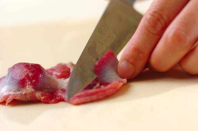 砂肝は白い部分を削ぎ落とし、スライスする。セロリは筋を引いて、斜め切りにする。セロリの葉は食べやすい大きさにちぎる。レモンはイチョウ切りにする。
