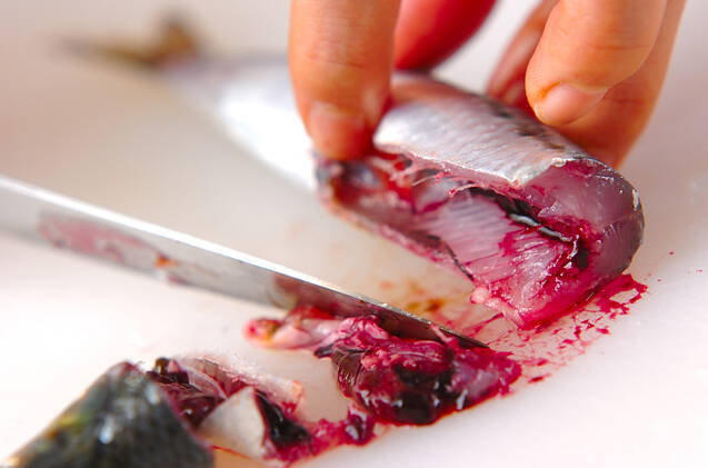 イワシは尾側から頭に向かって指先でなでるようにウロコを取り、頭を落として腹を斜めに切ってワタを出し、塩水できれいに洗い、水気を切る。大きい場合は尾を落とし、半分に切って下さい。