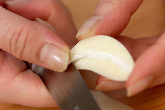 ニンニクは縦半分に切り、芽を取る。ショウガは皮ごときれいに水洗いし、薄切りにする。赤唐辛子は半分に割る。松の実はフライパンで香ばしく炒る。