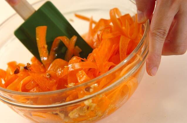 ボウルに<ドレッシング>の材料を混ぜ合わせて、ニンジンとミックスナッツを和える。