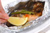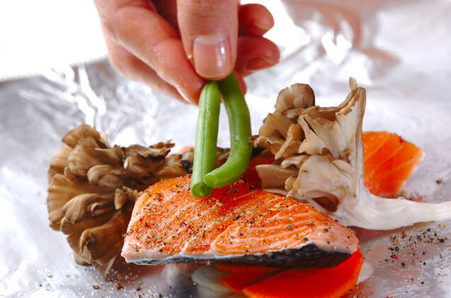 アルミホイルを2重にしてサラダ油を薄く敷き、白ネギ、ニンジン、マイタケ、サーモン、サヤインゲンとのせる。
