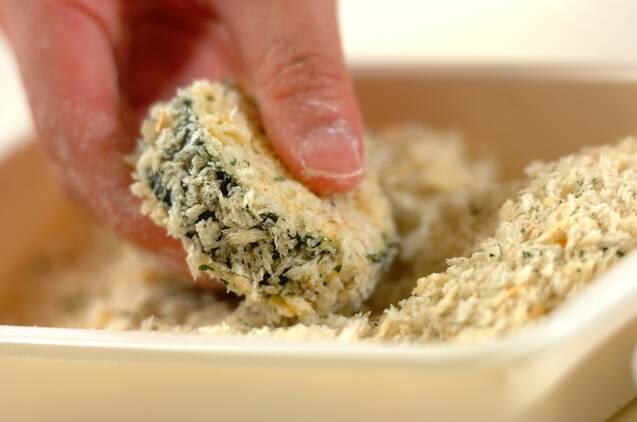 ズッキーニに小麦粉を薄くまぶし、溶き卵にくぐらせ、<合わせパン粉>をつける。