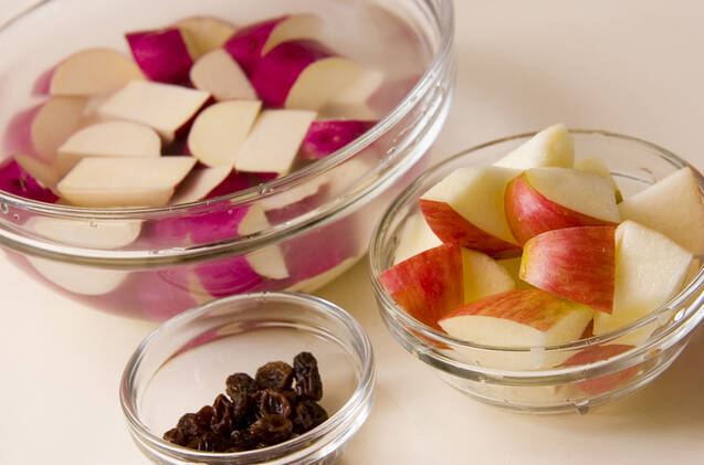 サツマイモは皮ごと水洗いし、1.5cmの厚みの半月切りにして水に放つ。(サツマイモが細い場合は輪切りにして水に放つ)リンゴは水洗いし、芯を切り取ってひとくち大に切り、塩水に通して水気を切る。レーズンは水につけて、柔らかくなれば水気を切る。