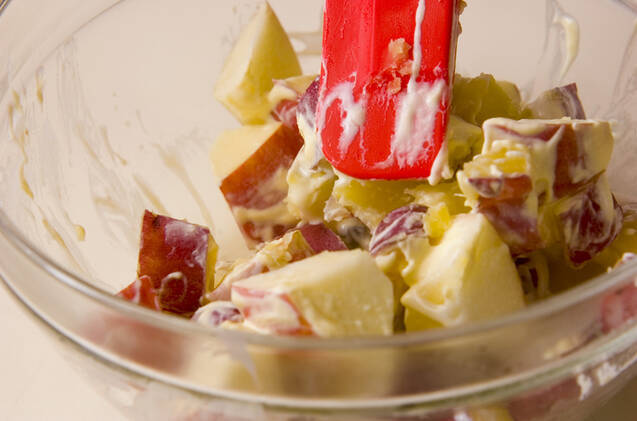 ボウルに<ドレッシング>を混ぜ合わせ、サツマイモ、リンゴ、レーズンを和えて、サラダ菜を敷いた器に盛る。