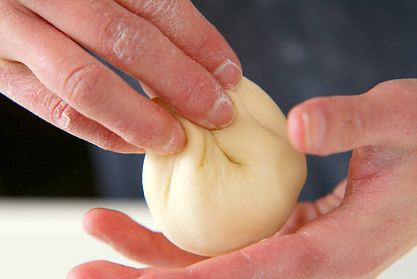 あんを包む。包み終わりを中華まんじゅうのようにつまんでしっかり閉じる。