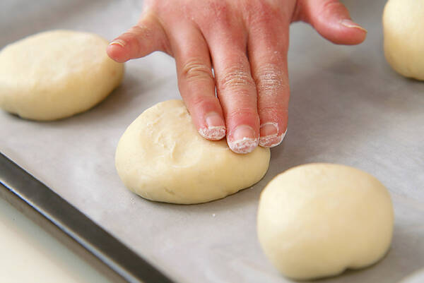 オーブンシートを敷いた天板に、とじめを下にして置き、手に軽く粉をつけて上から軽く押さえる。