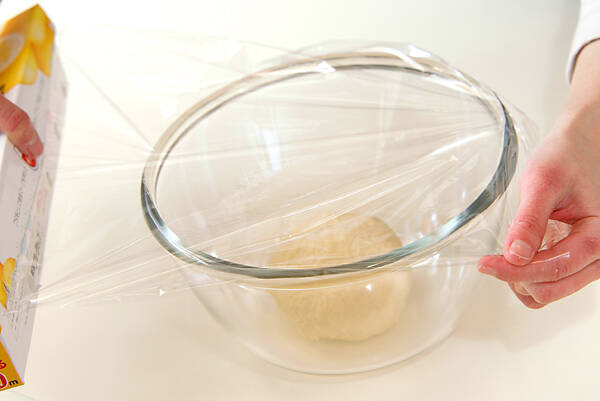 表面を丸くなめらかに生地をまとめ、とじめを下にしてボウルに入れ、ラップをして生地が2.5倍にふくれるまで一次発酵させる。(30℃、30~40分)