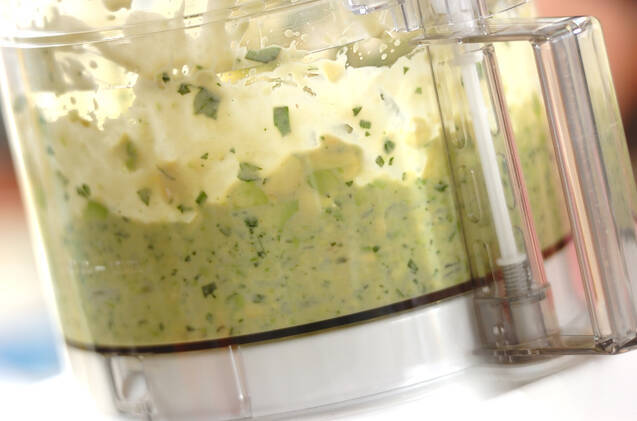 アボカドは種の周りを縦一周切り込みを入れ、両手に挟みねじるように2つに分け、包丁の角で種を突き刺して取り、果肉を取り出す。半量は1cm 角に切る。残り半量はザク切りにして<ソース>の材料と合わせ、フードプロセッサーなどにかけてペースト状にし、塩コショウで味を調える。