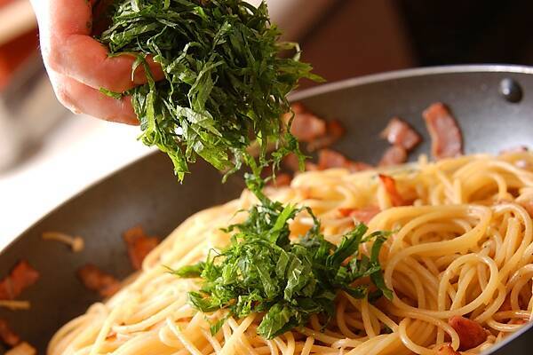 <調味料>を加え更に混ぜ合わせる。大葉を加え全体にからめながら混ぜ合わせ、器に盛り分ける。