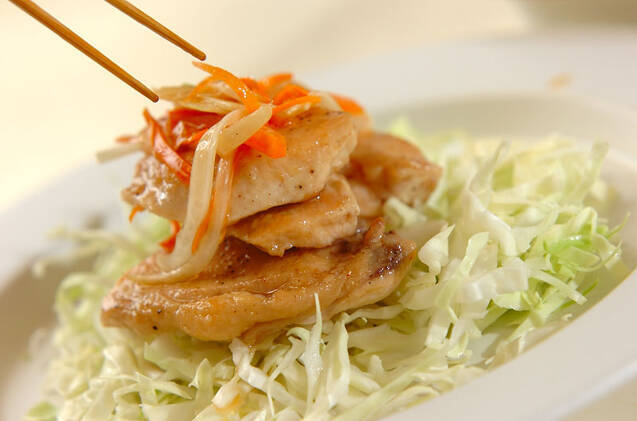 器にキャベツを広げ、鶏むね肉と一緒に漬け込んだ野菜を盛る。<マリネ液>を全体にかけ、大葉を飾るようにのせる。