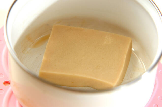 鍋に<高野豆腐の合わせだし>の材料を入れて火にかけ、煮たったら高野豆腐を加えて弱火にし、落とし蓋をして煮汁が少なくなるまで煮る。そのまま冷まし、軽く汁気をきって縦に4等分に切る。
