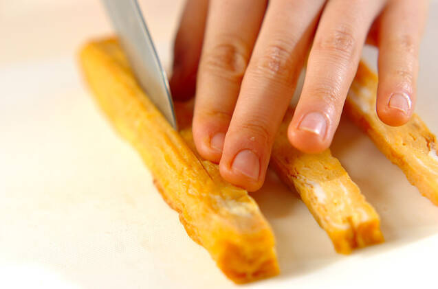 <卵焼き>の材料を混ぜ合わせ、サラダ油を薄くひいた卵焼き器に2~3回に分けて流し入れ、卵焼きを巻く。巻きすで巻き、冷めたら4本の棒状に切る。