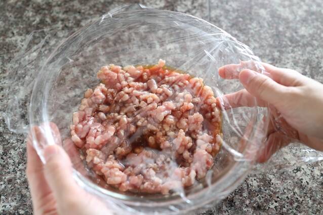 耐熱ボウルに<調味料>の材料と豚ひき肉を入れ、よく混ぜ、ふんわりラップをしてレンジで600Wで2分加熱する。