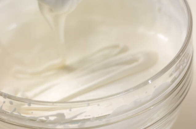 2種類の生クリームを合わせ、粉砂糖を加えボウルの底に氷水をあててトロミをつける。半量は冷蔵庫で冷やしておき、残りの半量は8分立てにする。