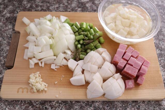 新玉ネギ、新ジャガイモ、グリーンアスパラ、カブ、ベーコンは1cmの角切りにする。ニンニクはみじん切りにする。