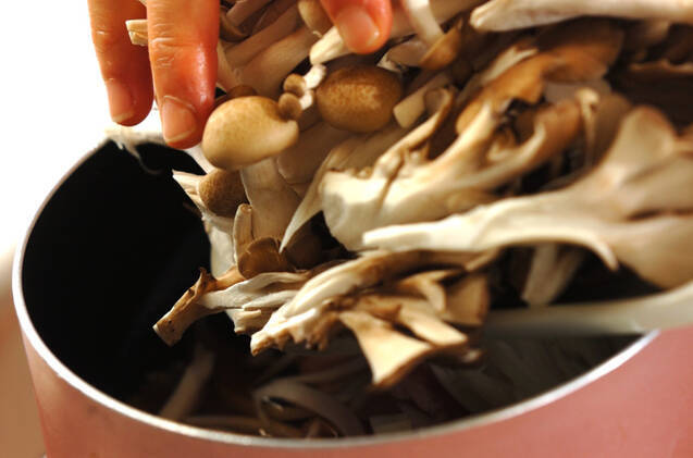 鍋に<合わせだし>の材料を入れて火にかけ、煮たったら(1)を入れて鍋に蓋をする。アクを取り除きながら、弱火で2~3分蒸し煮にし、塩で味を調える。