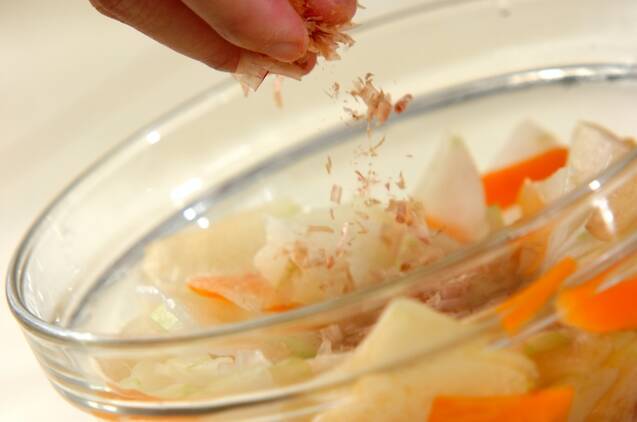 <ドレッシング>のボウルに(2)を加えて混ぜ合わせ、さらにかつお節を加えてからめ、器に盛る。