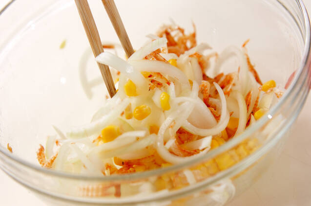 玉ネギが少ししんなりしたら、桜エビ、水煮コーンを加えてサックリ混ぜ、小麦粉を加えて全体に混ぜる。