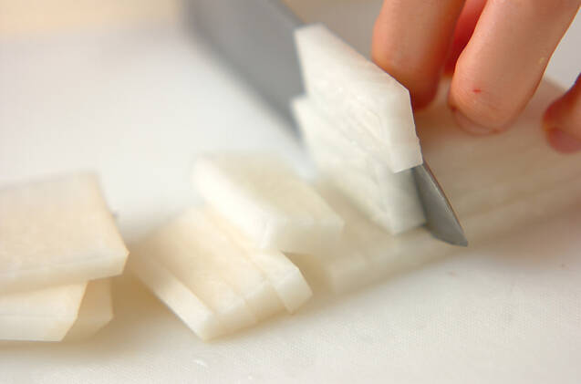 大根は皮ごときれいに水洗いして、幅5mm角の棒状に切り、塩をからめて10分置く。水気が出てきたらサッと水洗いし、しっかり絞る。
