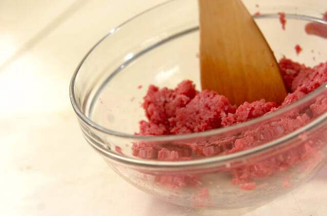 合いびき肉に酒と塩を加え、木ベラ等で全体にまとまるまでよく練り合わせる。