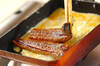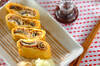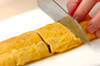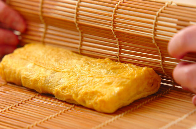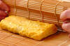 残りの卵液の1/2量を流し入れ、向こう側から手前に巻き、最後の卵液も同様にして巻く。全体に薄い焼き色がついたら、巻きすで形を整える。同様にもう1本作る。
