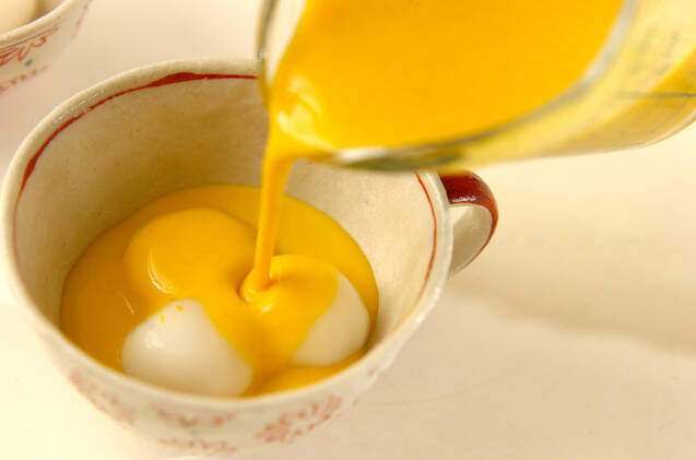 器に5の<白玉団子>を入れ、温めた3の<カボチャ汁粉>を注ぎ、ゆで小豆をのせる。