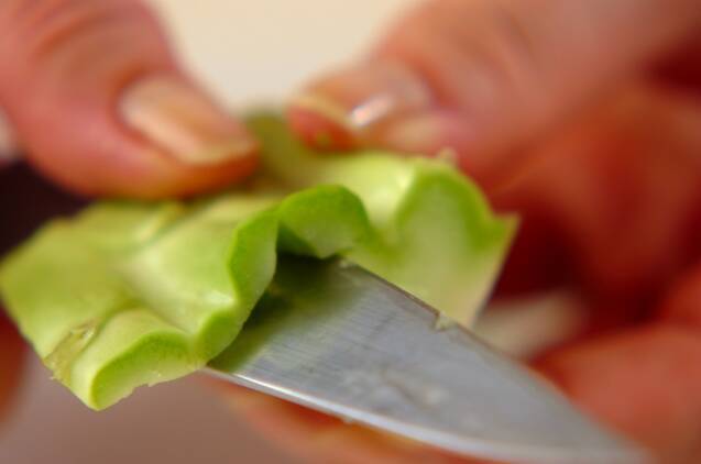 ブロッコリーは小房に分ける。茎の部分はかたい外皮をむき、ひとくち大の乱切りにする。