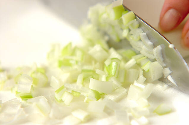 白ネギは粗いみじん切りにし、クコの実はぬるま湯につけて柔らかくもどし、水気をきる。