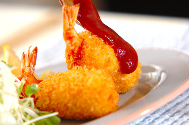 器に合わせキャベツ、トマト、エビのポテト衣フライを盛り合わせ、レモン、<合わせソース>を添える。