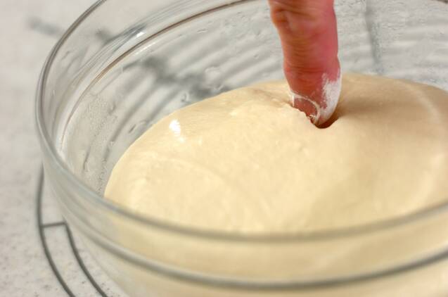 指に分量外の強力粉をつけて生地に第一関節くらいまで突き刺す。指の穴が残ればOK(フィンガーテスト)。