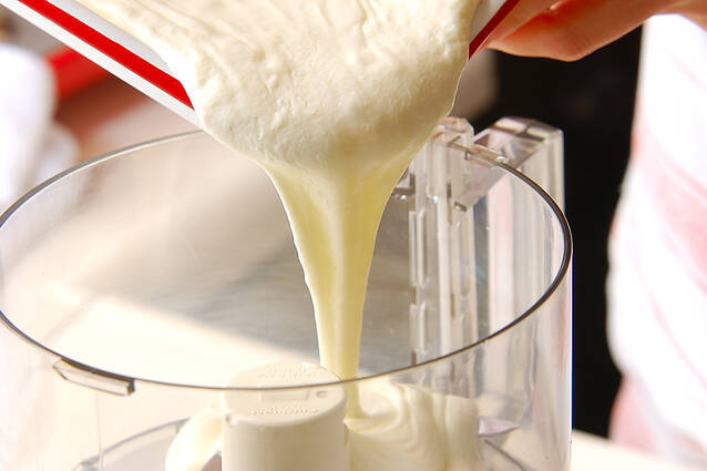 5が凍りかけたらフードプロセッサーに入れて撹拌し、なめらかな状態にする。なめらかな状態になったら再びバットに移し凍らせる。これを2~3回繰り返す。