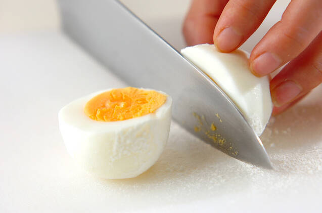 ゆで卵とブラウンマッシュルームは、<衣>の小麦粉を薄くからめ、ゆで卵は横半分に切る。揚げ油を170℃に予熱し始める。