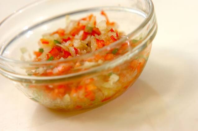 <ドレッシング>の材料を混ぜ合わせ、赤パプリカ、ピーマン、玉ネギをつけておく。
