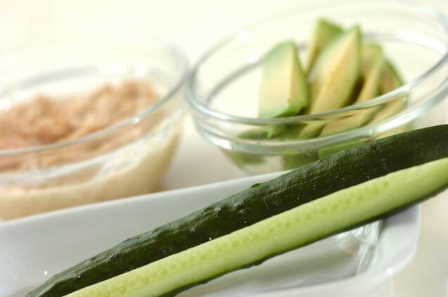 <寿司飯>を作る。ご飯に作り置き甘酢を切るように混ぜ、お皿、またはバットに広げて冷ます。アボカドは果肉をスプーン等で取り出し、幅1cmの棒状に切る。キュウリは縦半分に切る。<ツナマヨ>のツナは油をきってマヨネーズと混ぜ合わせる。