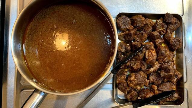 (9)で濾した鍋に<飴色玉ネギ>を加えかき混ぜる。カレールウとデミグラスルウを入れ、弱火でゆっくり溶かす。ルウが溶け切ったら肉を入れる。隣のコンロで適度なサイズのフライパンを用意し、お好みの野菜をバターソテーする。