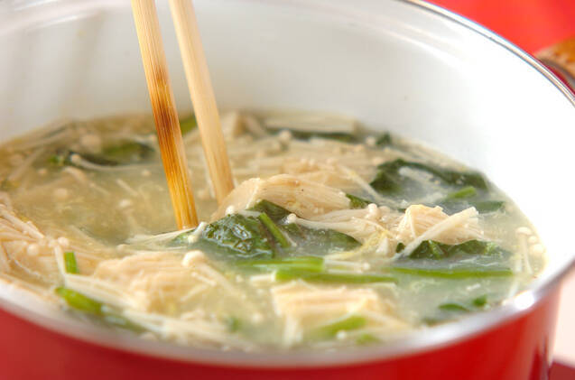 溶き卵を加え、菜ばしで大きく円を描くように混ぜ合わせ、卵がふんわり浮かんできたら、器に注ぎ分ける。