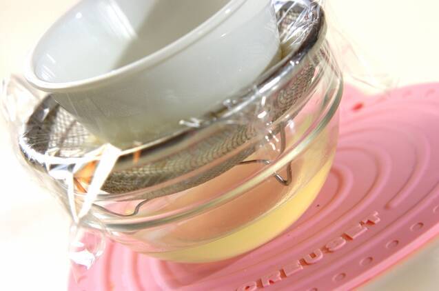 水きりヨーグルトを作る。ザルにクッキングペーパ―を敷き、ヨーグルトを入れて包みこみ上に重しをのせ、軽く上から押して約40分置く。