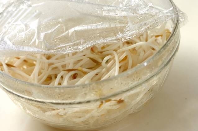 モヤシはサッと水洗いして耐熱容器に入れ、ラップをふんわりとかけて、電子レンジで2分程加熱する。塩コショウを振る。