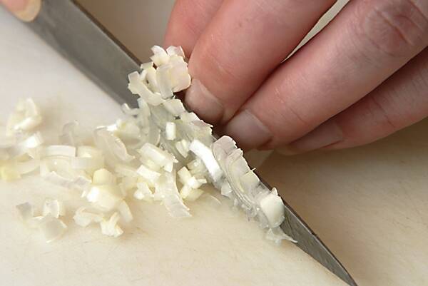 白ネギは縦に切り込みを入れてみじん切りにし、ショウガは皮をむいて、細かいのみじん切りにする。