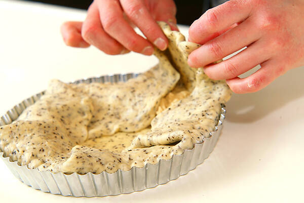 一旦セルクルを外し、中央部分に溶き卵をぬる。中央をあけて生地を内側に織り込んでいく。(卵は生地どうしをくっつける「のり」の役割です)
