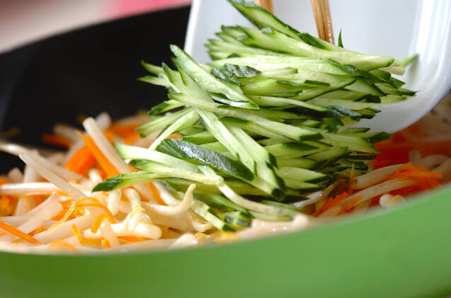 フライパンにゴマ油を入れて強火にかけニンジン、モヤシ、キュウリと順に炒める。塩コショウをして火を止め、作り置き甘酢を絡め、器に盛り分ける。