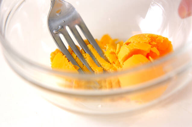 固ゆで卵は殻をむき、黄身と白身に分けフォークで粗くつぶす。