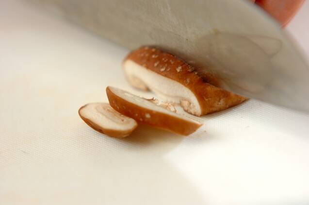 シイタケは汚れを拭き取り、石づきを切り落として軸と笠に切り分ける。軸は縦に裂き、笠は薄切りにする。